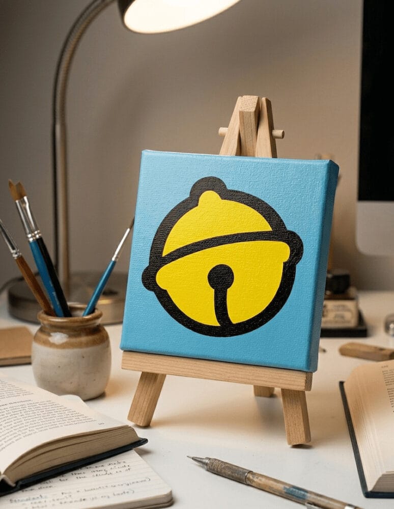 This striking piece brings a slice of nostalgic joy into your home with its bold, minimalist take on a beloved childhood icon. Focussing on the unmistakable golden bell of the world’s favourite robotic cat, the artwork uses a high-contrast palette to make a statement. The sunshine-yellow of the bell is set against a punchy, sky-blue background, framed by thick, clean black outlines that give it a contemporary graphic edge.