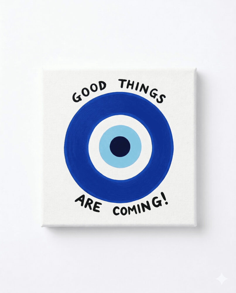 Invite a wave of positive energy and protection into your home with this wonderfully uplifting, hand-painted canvas. Front and centre is a striking, minimalist take on the classic evil eye motif—a timeless symbol meant to ward off negativity and attract good luck. Painted in deep, mesmerising shades of cobalt and sky blue, the talisman is surrounded by the beautifully hand-lettered affirmation “GOOD THINGS ARE COMING!”. This piece serves as a brilliant daily reminder to stay optimistic and embrace whatever the future holds.