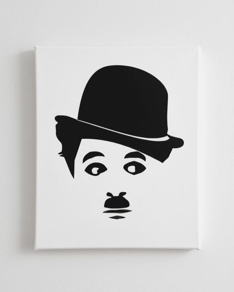Pay tribute to a true legend of the silver screen with this striking and minimalist artwork. “The Chaplin Gaze” captures the most recognisable features of Charlie Chaplin’s beloved “Little Tramp” character, using just a few elegant, bold black shapes. This piece is a masterpiece of “less is more,” instantly evoking the icon’s entire personality with just the famous bowler hat, his expressive, curious eyes, and that unmistakable moustache.