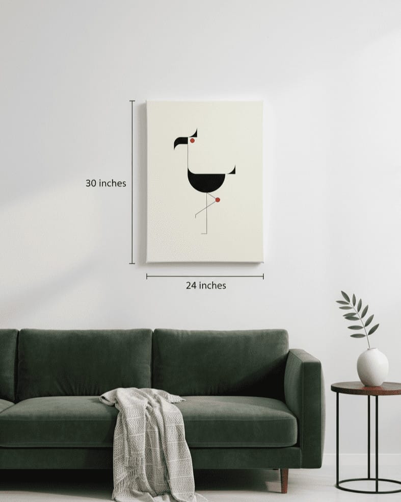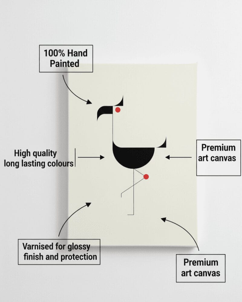 A masterpiece of modern minimalism. This handmade painting features a striking geometric bird in black, balanced on one leg, with two clever pops of red. Crafted with vibrant, long-lasting paints on premium canvas for a sophisticated, clean look.